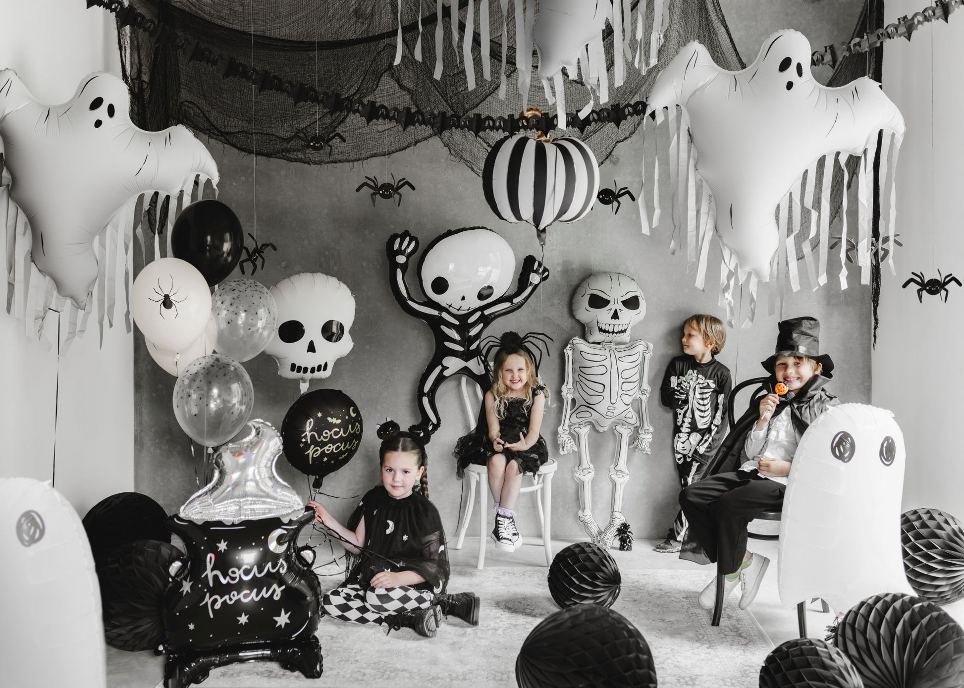 Połączenie białych, przeźroczystych i czarnych balonów sprawia, że dekoracja nabiera wyjątkowego, halloweenowego charakteru. To idealna propozycja na przyjęcie tematyczne, dekorację domu, lokalu, sali czy sklepu. Balony świetnie prezentują się zarówno jako samodzielny bukiet, jak i w połączeniu z innymi zestawami halloweenowymi.